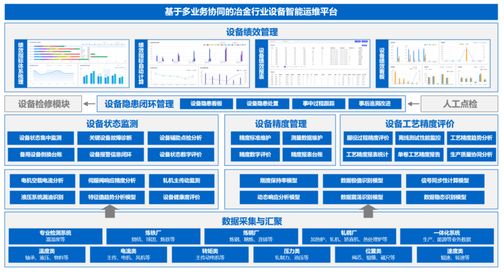 设计院公司打造的“基于多业务协同的冶金行业设备智能运维解决方案”,精准聚焦冶金行业设备运维痛点。依托工业互联网、人工智能等前沿技术,全方位构建设备、产线、公司三级纵向贯穿的智能运维体系,打破传统运维中各环节数据孤立、业务割裂的现状。通过打造设备级状态监测与故障诊断、产线级设备服役性能评价分析、公司级设备运维业务协同,实现多层级数据协同分析与信息高效流转,实现设备故障根源的精准溯源与预判;开展关键设备服役精度深度解析,赋能公司运维决策智能化,为冶金企业智能化转型提供了高效可行的技术路径。